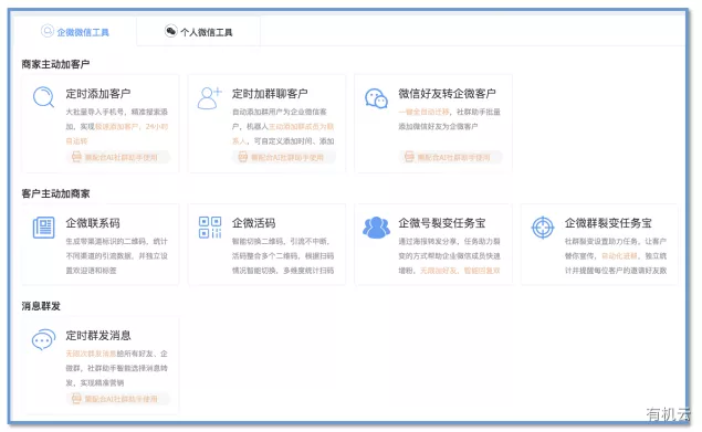 企微微信工具包括商家主动加粉、客户主动加好友以及消息群发等三大主要功能。