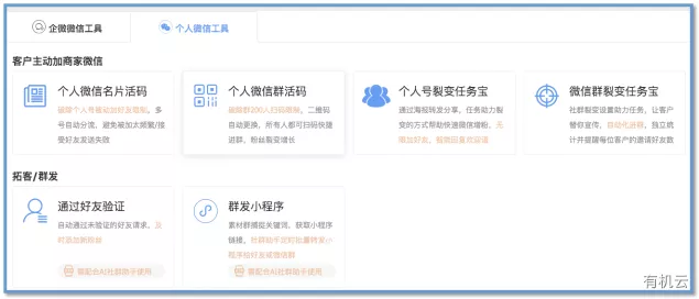 企微魔方的最大亮点在于加粉的智能、高效和便利。自动批量添加新用户,个性化设置欢迎语,还可以老带新的方式实现快速裂变涨粉。企微魔方主要分为企业号导向的企微微信工具和个人号导向的个人微信工具。大致功能如下图: