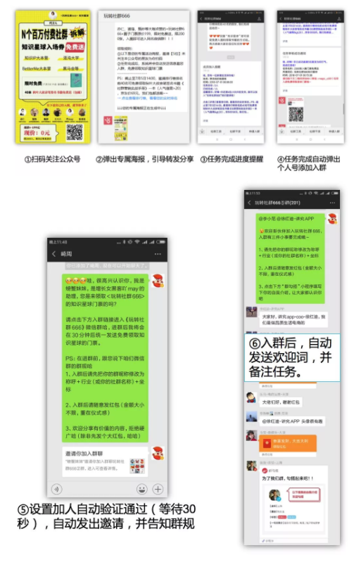 群裂变的原理也是用诱饵海报启动,只不过海报上的二维码是入群二维码,入群后,群内机器人小助手会自动发消息引导用户转发海报到朋友后并截图到群里,完成任务的朋友,小助手就通知其添加个人号,领取赠品。
