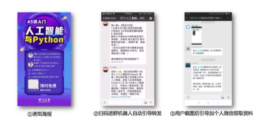 机器人代替部分人工劳动,可以实现自动化裂变,例如自动推送活动规则,完成转发分享任务后,自动回复福利让用户自动领取。