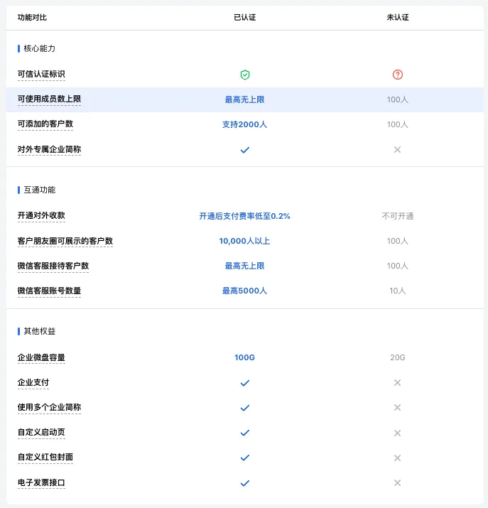 不认证将影响企业在企业微信中通讯录可使用人员数量、企业简称、自定义启动页、红包封面等功能,详见以下表格。