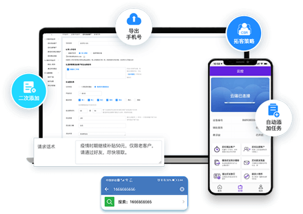自动加手机号、订单拓客、自动加群内好友等。添加客户后,自动回复、自动拉进群、定时群发等,完善自动营销流程。